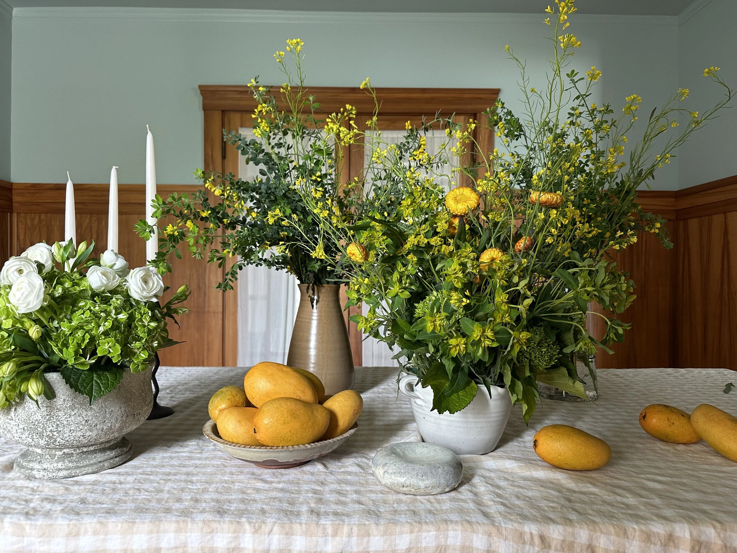 May Flowers May 5 Written By Claire Chadwick Flower Market - Thursday Morning Mizuna going in vases Hydrangeas/ Astronomia/ Ranunculus Flowers and Mangos Claire Chadwick