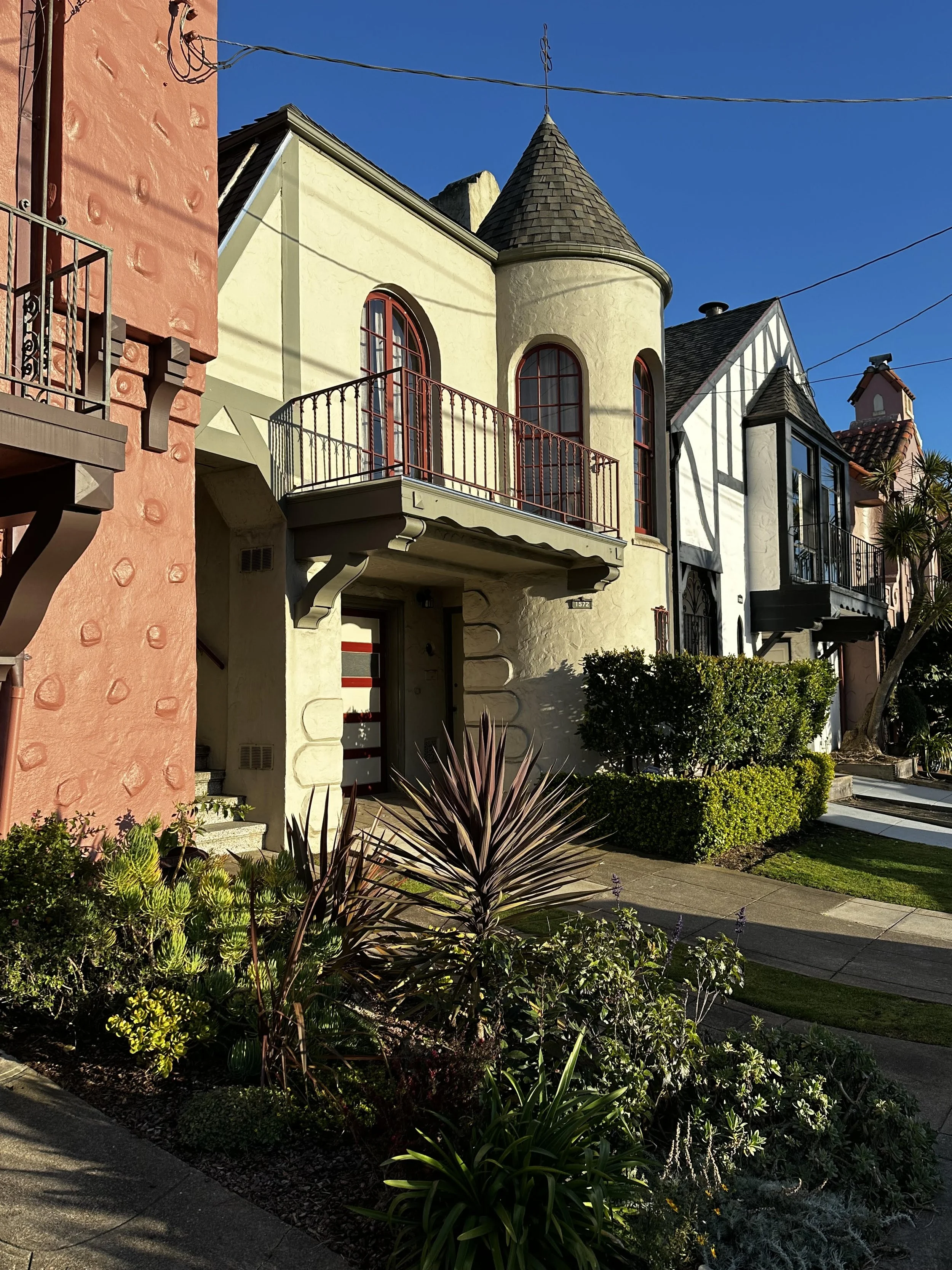 Along with his father and brother, Oliver formed the company Marian Real Estate Co. and together they built almost 200 homes. 93 of these homes are located on 33rd-36th avenues, between Kirkham and Lawton in the Sunset. There is a theory, untested by myself, that the houses that the Rousseau’s built were better quality than the many other developers operating in the Sunset and Richmond neighborhoods at the time. I can attest that their houses definitely stand out from a stylistic perspective. You’ll be pleased to learn, as I was, that there is an architectural term for the style of many of the houses that the Rousseau’s built and it is called Storybook style. Think whimsy, playfulness and turrets, as going into detail will require another blog post.